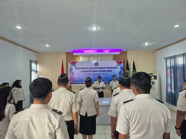 Bitung (06/01) – Lembaga Pemasyarakatan Kelas IIB Bitung melaksanakan kegiatan Deklarasi Janji Kinerja Pegawai Tahun 2026 sebagai bentuk komitmen bersama dalam mengawali pelaksanaan tugas dan fungsi pemasyarakatan di Tahun 2026.