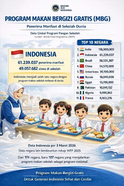 Jakarta — Program Makan Bergizi Gratis (MBG) yang dijalankan pemerintah melalui Badan Gizi Nasional (BGN) menempatkan Indonesia sebagai salah satu negara dengan program makan sekolah terbesar di dunia. Berdasarkan data yang dirilis per 3 Maret 2026, jumlah penerima manfaat program ini telah mencapai 61.239.037 orang, dengan 49.057.682 di antaranya merupakan siswa sekolah.