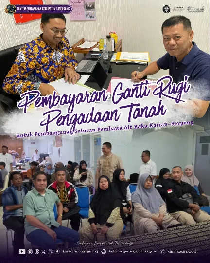 Kabupaten Tangerang, 09 April 2026 – Kantor Pertanahan Kabupaten Tangerang melaksanakan pembayaran uang ganti rugi dalam rangka pengadaan tanah untuk pembangunan Saluran Pembawa Air Baku Karian–Serpong (KSCS). Kegiatan ini merupakan bagian dari upaya pemerintah dalam mendukung percepatan pembangunan infrastruktur strategis nasional.