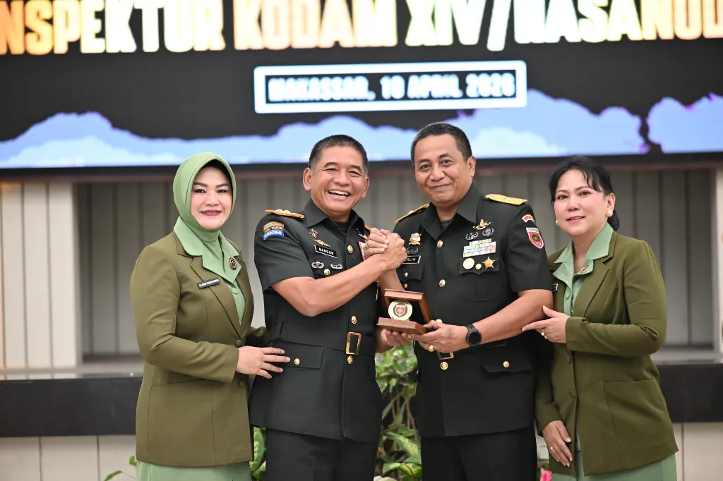 Makassar – Pangdam XIV/Hasanuddin Mayjen TNI Bangun Nawoko didampingi Ketua Persit KCK Daerah XIV/Hasanuddin Ny. Renny Bangun Nawoko memimpin Serah Terima Jabatan (Sertijab) dan Pelepasan Inspektur Kodam (Irdam) XIV/Hsn. Dalam kesempatan tersebut, jabatan Irdam diserahterimakan dari Brigjen TNI Berlin Germany, S.Sos., M.M., CFrA., CHRMP., kepada Brigjen TNI Wulang Nur Yudhanto, S.E., sebagai bagian dari dinamika organisasi dan pembinaan satuan, bertempat di Balai Pertemuan Hasanuddin (BPH) Makodam, Jl. Urip Sumoharjo, Kota Makassar. Jumat, (10/4/2026).